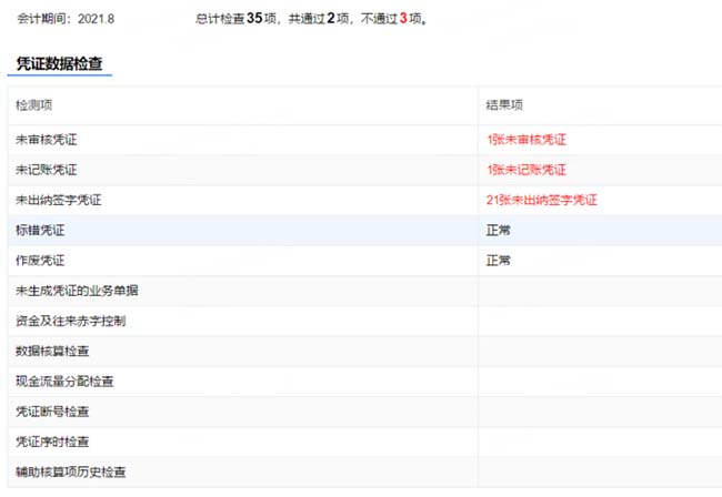 通過(guò)數(shù)據(jù)檢查,沒(méi)有問(wèn)題的在結(jié)果項(xiàng)中顯示【正常】,如果沒(méi)有通過(guò)的,在結(jié)果項(xiàng)中會(huì)列示出有多少憑證存在異常,并且是紅色提示,點(diǎn)擊紅色提示,就可以聯(lián)查到具體的記錄,然后在對(duì)應(yīng)的界面進(jìn)行審核或者記賬造成即可。
