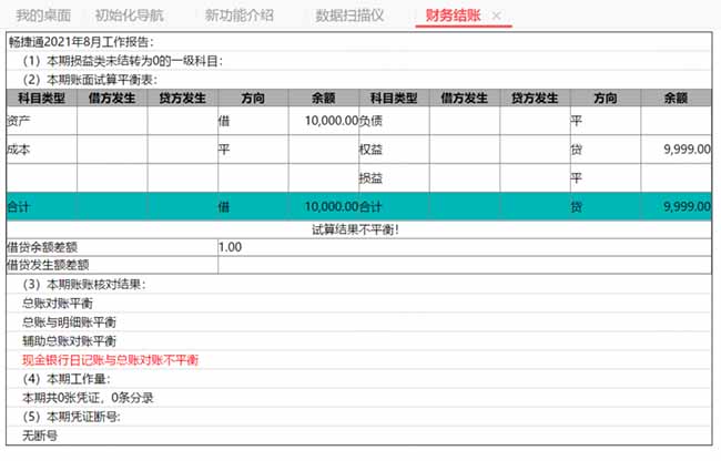 下面截圖檢查結(jié)果顯示期末試算不平衡,點(diǎn)擊【查看】,展示的是當(dāng)月的月度工作報(bào)告,可以具體顯示當(dāng)月科目的借方、貸方發(fā)生情況以及余額情況,并且提示試算結(jié)果是否平衡。對(duì)于不平衡的,在下面的【本期賬賬對(duì)核對(duì)結(jié)果】里會(huì)顯示具體哪一項(xiàng)不平,然后再根據(jù)實(shí)際情況進(jìn)行調(diào)整。