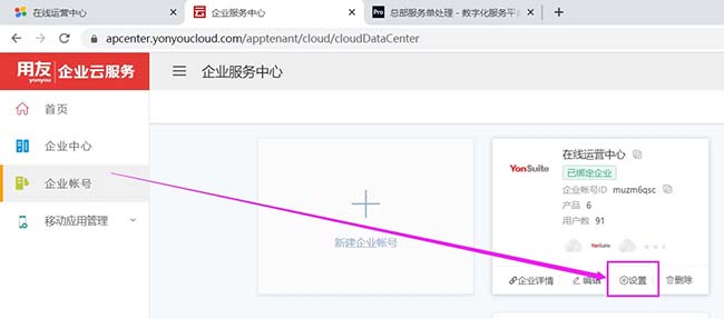3、在跳轉的企業(yè)服務中心界面,點擊企業(yè)帳號-找到對應租戶,點擊設置按鈕,進入設置默認密碼界面
