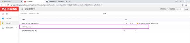 2、管理員打開企業(yè)服務中心,可以針對租戶設置這個租戶下所有新增用戶的默認密碼,如此處為空,則走的是出廠密碼 yonyou@1988
