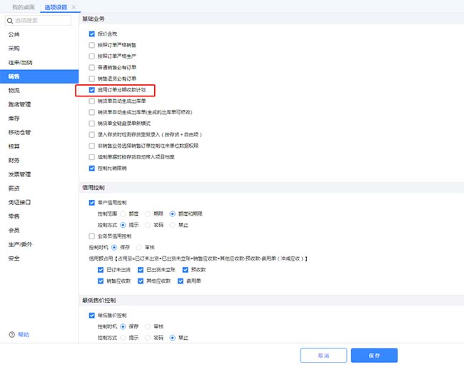 1、點(diǎn)擊【系統(tǒng)管理】-【選項(xiàng)設(shè)置】-【銷(xiāo)售】勾選上【啟用訂單分期收款計(jì)劃】