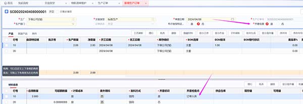然后做生產(chǎn)訂單;表頭的齊套檢查默認(rèn)為是(取交易類型設(shè)置的);材料信息的齊套檢查點(diǎn)為訂單入庫(取物料清單中設(shè)置的)