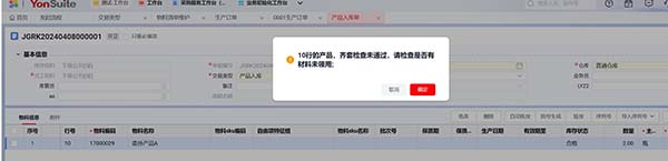 這種訂單保存審核后,直接入庫時(shí)會(huì)報(bào)錯(cuò)的;提示材料不足;