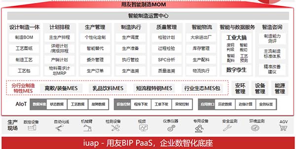 用友 MOM 系統(tǒng)融合 IoT、AI 與行業(yè)機(jī)理模型,覆蓋生產(chǎn)全要素管控;與生態(tài)伙伴一起,提供從自動(dòng)化控制到企業(yè)運(yùn)營(yíng)管理的全工廠數(shù)字化方案。基于用友在企業(yè)級(jí)市場(chǎng)中的多年領(lǐng)先經(jīng)驗(yàn),將L4計(jì)劃層、運(yùn)營(yíng)層業(yè)務(wù)數(shù)據(jù)與L3執(zhí)行層貫通,真正實(shí)現(xiàn)客戶的產(chǎn)銷數(shù)據(jù)實(shí)時(shí)反饋,及時(shí)調(diào)整,做到柔性制造、產(chǎn)銷協(xié)同。避免了以往數(shù)字化建設(shè)過(guò)程中L4級(jí)與L3級(jí)數(shù)據(jù)隔離、口徑不統(tǒng)一、需要點(diǎn)對(duì)點(diǎn)集成的問(wèn)題。