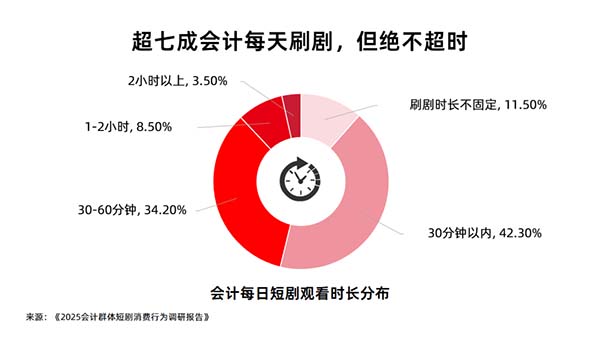 對(duì)于經(jīng)常需要處理復(fù)雜賬目、嚴(yán)守時(shí)間節(jié)點(diǎn)的會(huì)計(jì)人來(lái)說(shuō),時(shí)間觀念已經(jīng)深入骨髓。這種職業(yè)特性也完美體現(xiàn)在他們的短劇觀看習(xí)慣中。讓人驚訝的是,會(huì)計(jì)人群的短劇觀看率高達(dá)76.5%,堪稱短劇市場(chǎng)的“隱形主力軍”。但更讓人驚嘆的是他們的時(shí)間控制能力——就連看劇都要嚴(yán)格計(jì)時(shí)!