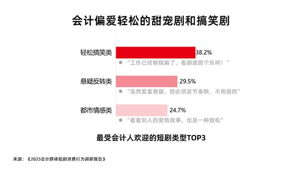 經(jīng)過(guò)一天與數(shù)字、報(bào)表的“斗智斗勇”,會(huì)計(jì)人們最需要的是什么?答案可能出乎你的意料——是徹底的大腦放松!調(diào)研結(jié)果顯示,會(huì)計(jì)人在短劇題材選擇上表現(xiàn)出明顯的“反職場(chǎng)”傾向。
