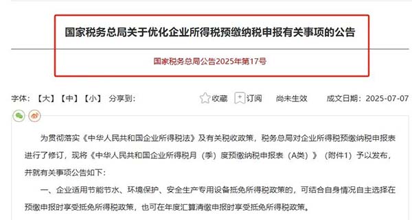 10月1日起,《國(guó)家稅務(wù)總局關(guān)于優(yōu)化企業(yè)所得稅預(yù)繳納稅申報(bào)有關(guān)事項(xiàng)的公告》(國(guó)家稅務(wù)總局公告2025年第17號(hào))新政正式執(zhí)行。