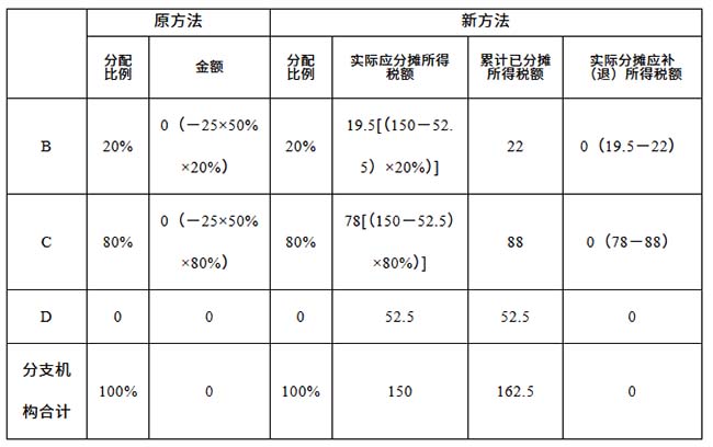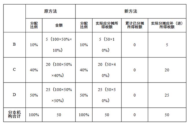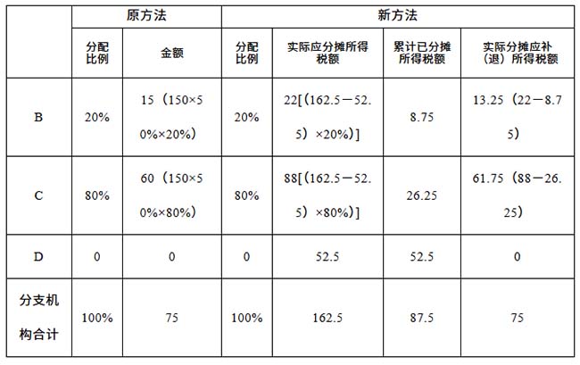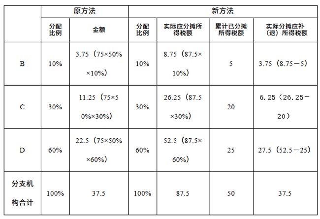案例中,由于第二季度發(fā)現(xiàn)第一季度C、D分支機(jī)構(gòu)分配比例計(jì)算錯(cuò)誤,在第二季度申報(bào)時(shí)按照新方法計(jì)算的C分支機(jī)構(gòu)應(yīng)補(bǔ)稅額比原方法少5萬(wàn)元;D分支機(jī)構(gòu)應(yīng)補(bǔ)稅額比原方法多5萬(wàn)元;B分支機(jī)構(gòu)分配比例沒(méi)有錯(cuò)誤,兩種方法計(jì)算結(jié)果一致。D分支機(jī)構(gòu)注銷(xiāo)后,需重新計(jì)算分配比例,在第三季度申報(bào)時(shí)按照新方法計(jì)算的B分支機(jī)構(gòu)應(yīng)補(bǔ)稅額比原方法少1.75萬(wàn)元,C分支機(jī)構(gòu)應(yīng)補(bǔ)稅額比原方法多1.75萬(wàn)元。