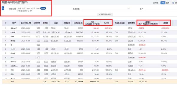 通過(guò)后臺(tái)可以清楚地知道交易次數(shù)、銷(xiāo)售金額、無(wú)稅金額、成本金額、毛利潤(rùn)、凈利潤(rùn)等,一張圖就能清晰知道每個(gè)客戶(hù)給公司帶來(lái)了多少毛利、多少凈利。