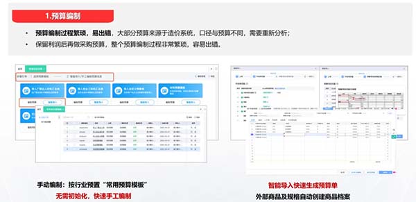 預(yù)算編制:支持手工編制,更支持智能導(dǎo)入,比如廣聯(lián)達(dá)、鴻業(yè)系統(tǒng)等預(yù)算直接能導(dǎo)入進(jìn)來(lái)