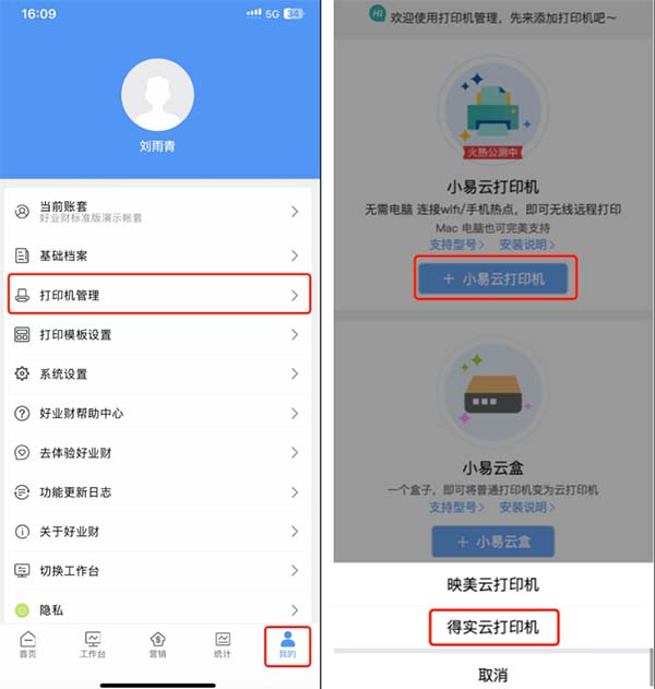 2、打開好生意/好業(yè)財(cái) APP,并進(jìn)入【我的】-【打印機(jī)管理】頁面,點(diǎn)擊【小易云打印】-【+小易云打印機(jī)】-【得實(shí)打印機(jī)】