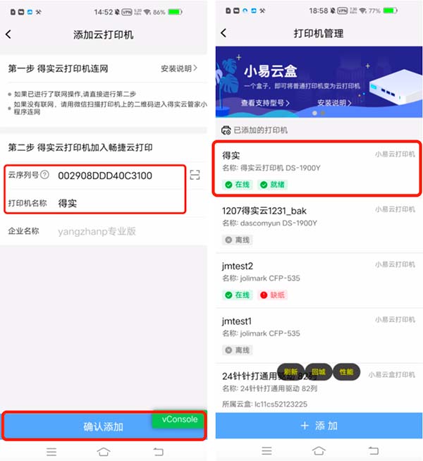 3、在打開的【得實(shí)云打印機(jī)】添加頁面,將打印機(jī)機(jī)身上的云序號,填寫在【云序列號】中,并為打印機(jī)起一個(gè)名字。點(diǎn)擊【確認(rèn)添加】,則打印機(jī)將會添加在打印機(jī)管理頁面。