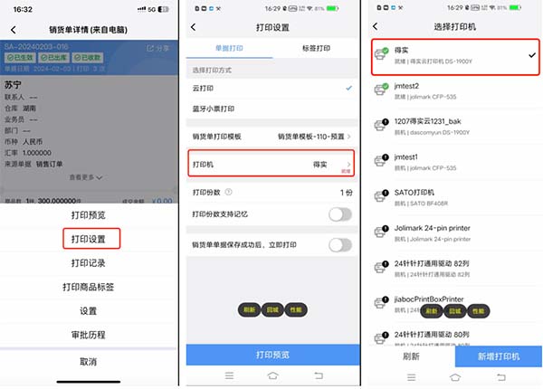 4、添加完成后,即可在各單據(jù)的打印預(yù)覽頁面中選擇該打印機(jī)