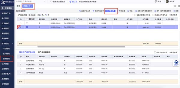 委外訂單與齊套分析,采購(gòu)不發(fā)愁:客戶(hù)下單或者根據(jù)銷(xiāo)售預(yù)測(cè),就在【委外管理】-【委外加工單】里下單。通過(guò)加工單的【齊套分析】功能,系統(tǒng)會(huì)自動(dòng)算出生產(chǎn)這批玩具還缺多少材料,這樣采購(gòu)就更有依據(jù)了。