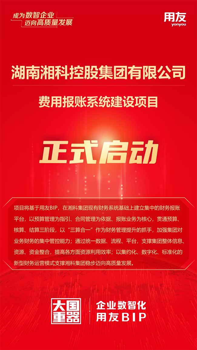 “十四五”時期是湘科集團全面推動高質(zhì)量發(fā)展的關鍵期。湘科集團積極貫徹落實國務院、國資委提出的“加快推進國有企業(yè)數(shù)字化轉型”要求,攜手用友開啟財務數(shù)智化建設新征程,以財務數(shù)智化牽引集團整體數(shù)智化,支撐企業(yè)在新時期做優(yōu)做大做強。