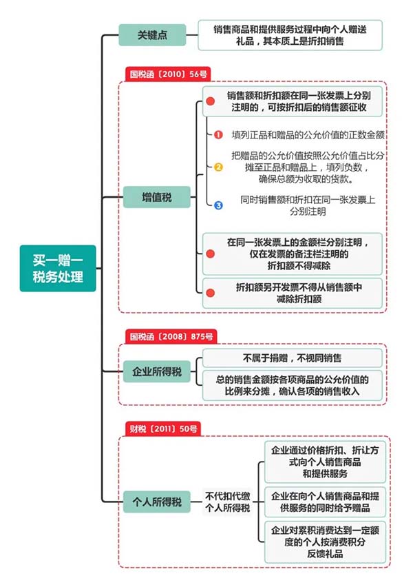一種處理方式是,“買(mǎi)一贈(zèng)一”屬于折扣銷(xiāo)售。比如(四川省國(guó)家稅務(wù)局公告2011年第6號(hào))規(guī)定:“買(mǎi)物贈(zèng)物”方式,是指在銷(xiāo)售貨物的同時(shí)贈(zèng)送同類(lèi)或其他貨物,并且在同一項(xiàng)銷(xiāo)售貨物行為中完成,贈(zèng)送貨物的價(jià)格不高于銷(xiāo)售貨物收取的金額。對(duì)納稅人的該種銷(xiāo)售行為,按其實(shí)際收到的貨款申報(bào)繳納增值稅,但應(yīng)按照《國(guó)家稅務(wù)總局關(guān)于確認(rèn)企業(yè)所得稅收入若干問(wèn)題的通知》(國(guó)稅函〔2008〕875號(hào))第三條的規(guī)定,在賬務(wù)上將實(shí)際收到的銷(xiāo)售金額,按銷(xiāo)售貨物和隨同銷(xiāo)售贈(zèng)送貨物的公允價(jià)值的比例來(lái)分?jǐn)偞_認(rèn)其銷(xiāo)售收入,同時(shí)應(yīng)將銷(xiāo)售貨物和隨同銷(xiāo)售贈(zèng)送的貨物品名、數(shù)量以及按各項(xiàng)商品公允價(jià)值的比例分?jǐn)偞_認(rèn)的價(jià)格和金額在同一張發(fā)票上注明。