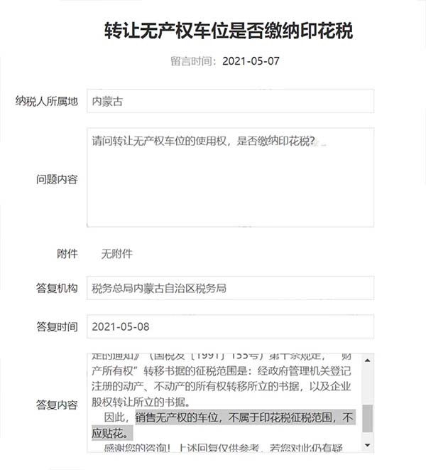 2.轉(zhuǎn)讓無(wú)產(chǎn)權(quán)車位是否繳納印花稅?