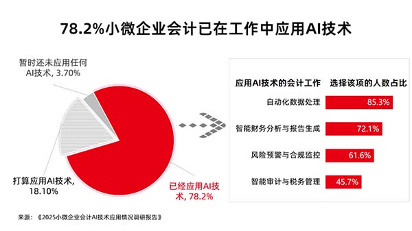 AI確實會取代部分基礎(chǔ)會計工作,但這恰恰為會計行業(yè)轉(zhuǎn)型升級提供了契機。未來的會計,將不再是簡單的"賬房先生",而是企業(yè)價值的創(chuàng)造者。那么,在這場智能變革中,小微企業(yè)的會計們究竟有多少工作已經(jīng)融入了AI技術(shù)?他們又是如何在這場變革中實現(xiàn)智能轉(zhuǎn)型的?今天,《2025小微企業(yè)會計AI技術(shù)應(yīng)用情況調(diào)研報告》就來深度揭秘!