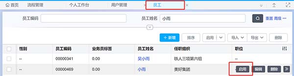 Step2:在員工列表中,鼠標放置目標行,點擊啟用員工。