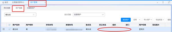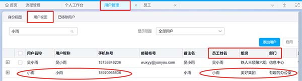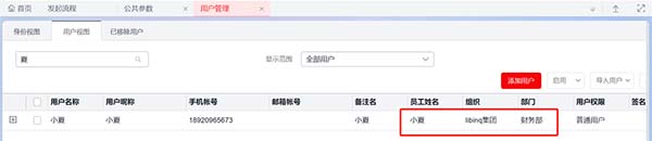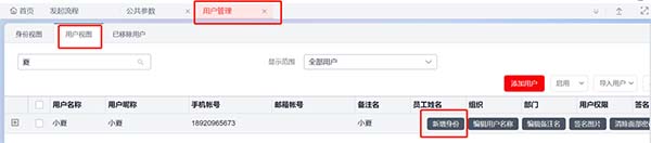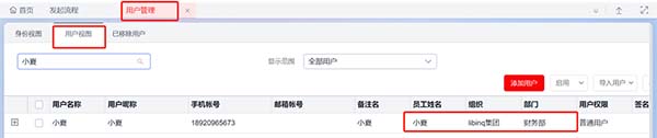 效果展示:用戶管理中用戶視圖下自動生成對應(yīng)已關(guān)聯(lián)員工的用戶賬號。
