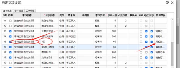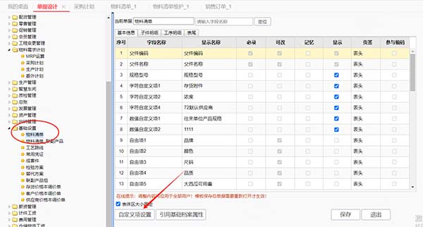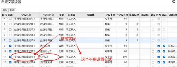 1、設置(字符公用自定義項3)為拼接自定義項字段。關聯(lián)單據(jù)(物料清單、MRP運算單、采購計劃、請購單、采購訂單);