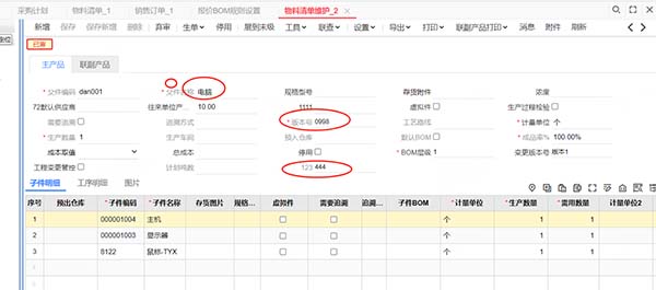3、維護物料清單(電腦-版本號0998),物料清單來源單字符公用自定義項3字段(444);