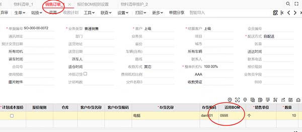 4、新增銷售訂單電腦10個,維護BOM版本(0998);